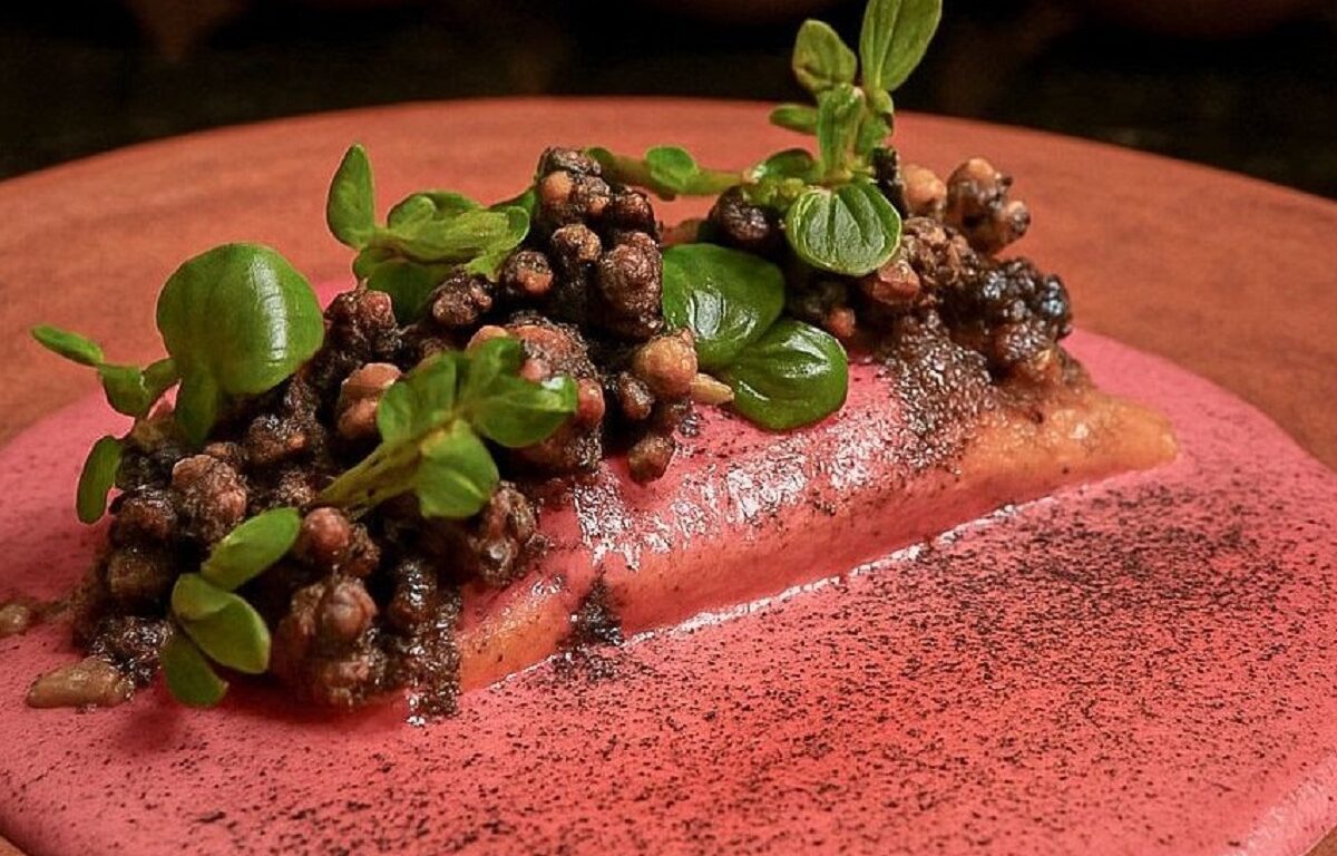 El chef Gordillo concibió este menú con la intención de que cada detalle tenga un trasfondo. Su propuesta central es un tamal en mole rosa relleno de carne de la región, acompañado con frutos secos y tomates deshidratados, coronado con un esquite de granos de elote cubierto en ceniza. El color vibrante del mole proviene del betabel, y la ceniza tiene un significado profundo. En la cultura maya, la ceniza está asociada con la trascendencia y el paso de una vida a otra. Para el chef, este elemento se convierte en un homenaje a las mujeres que han luchado contra el cáncer de mama y a aquellas que siguen enfrentando día a día la enfermedad. El plato transmite la idea de transformación, de resiliencia y de renacimiento.